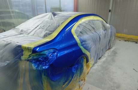 修理箇所をマスキングテープで保護し、塗装の準備を行います。 塗装面をきれいにし、プライマーを塗布します。 車の元の色に合わせた塗料を使用して塗装を行います。 均一に塗布し、乾燥させます。必要に応じて、複数回塗装を行います。